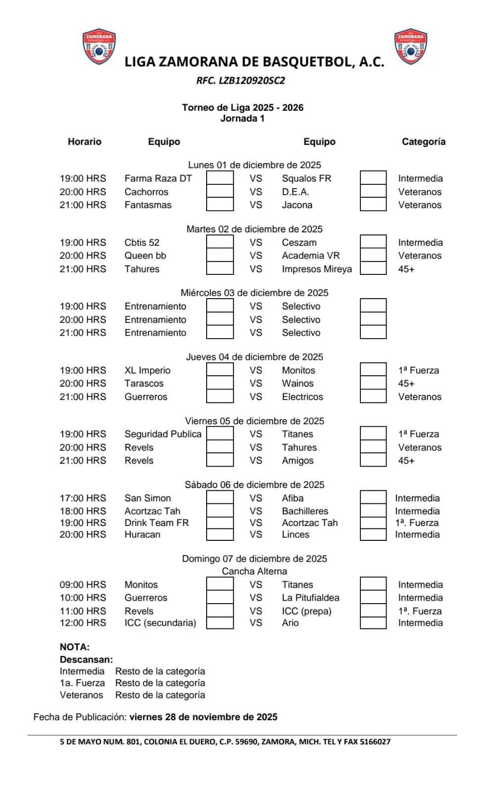 Rol de Juegos Academia de Baloncesto Tangancícuaro