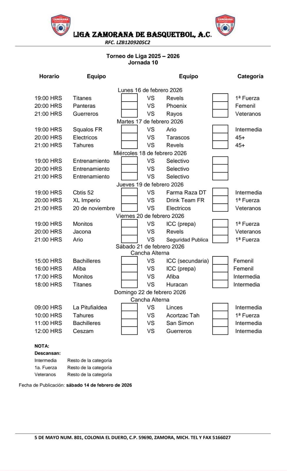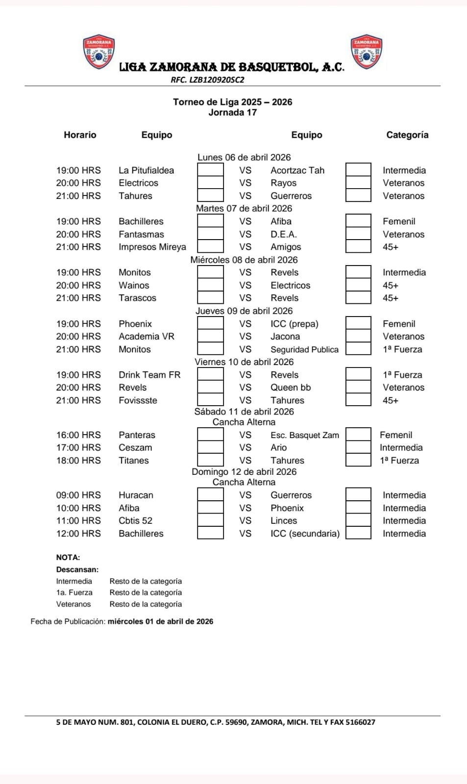 Rol de Juegos Academia de Baloncesto Tangancícuaro