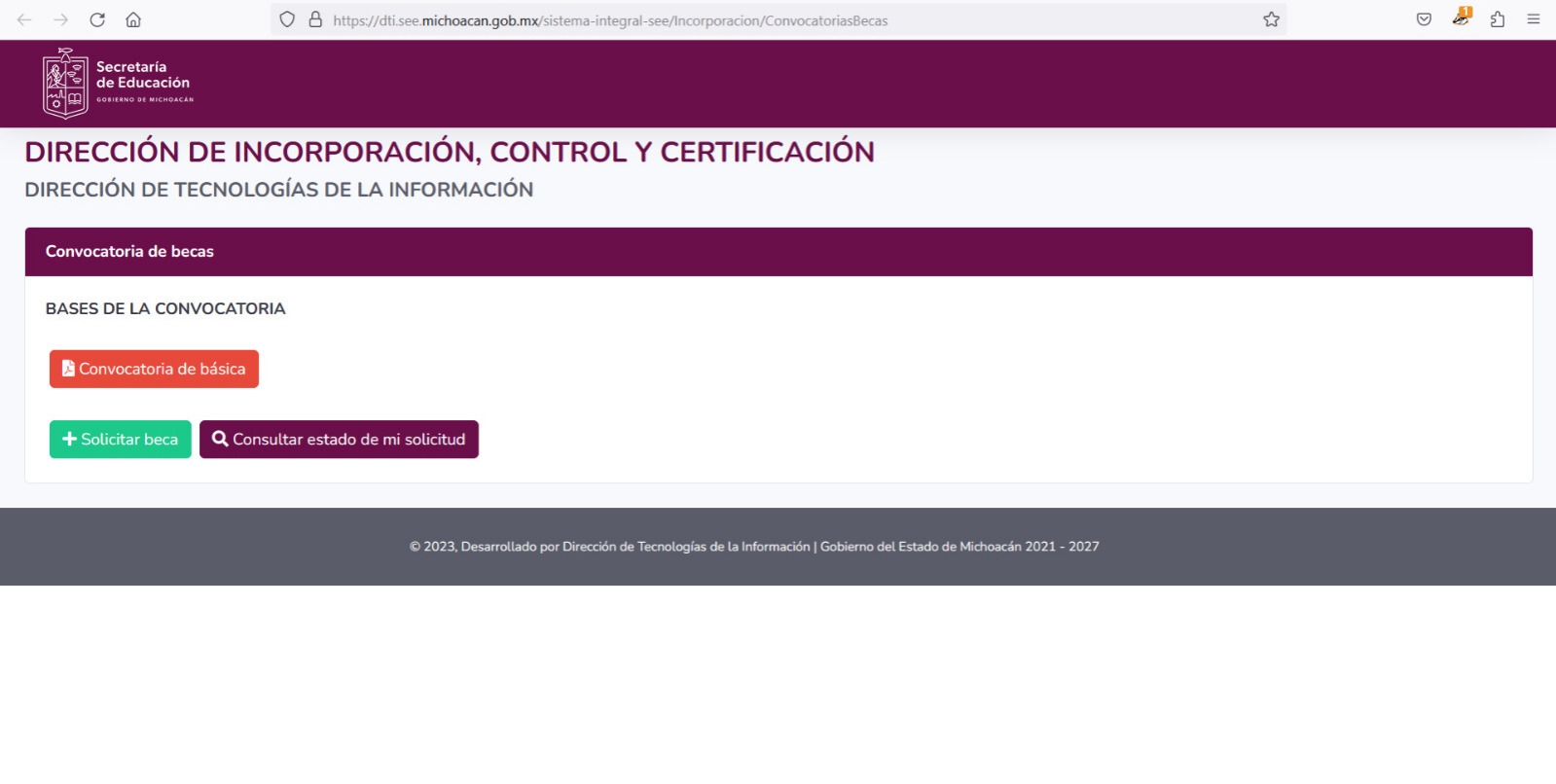 La solicitud deberá registrarse en la página: https://dti.see.michoacan.gob.mx/sistema-integral-see/Incorporacion/ConvocatoriasBecas, en el apartado donde dice Solicitar Beca, donde deberán ingresar el nombre de la escuela para ver si ya conformó su Comité de Becas, mismo que revisará cada una de las solicitudes y porcentaje de exención que corresponderán a los alumnos beneficiados.